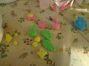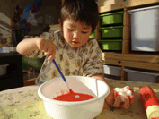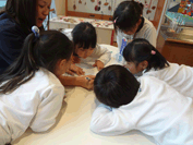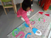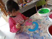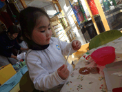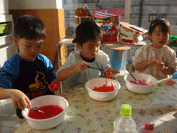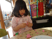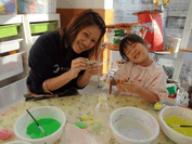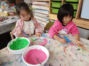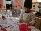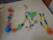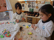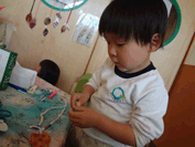 「きらきらの葉っぱネックレスにしよう!」というNちゃんのアイディアで、たくさんの素材の中からスパンコール選び、1つずつボンドで丁寧に張り付けていました。また紙粘土に絵の具を混ぜて、オリジナルビーズを作ることに夢中な子ども達!好きな形に出来る紙粘土が大好きなようです☆