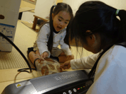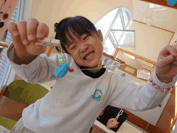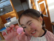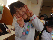 「もっとキラキラのネックレスを作りたい!!!」という子ども達からの熱い要望があり、ついに輝くビーズを使ってネックレス作りに挑戦☆細いテグスに集中して通し、紙粘土ビーズと組み合わせていました☆出来上がったキラキラのネックレスを付けて・・・パシャリッ♪ (●^o^●) |
