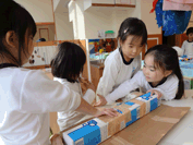 本物のネックレス屋さんを見学して、これから何を作ろうか真剣に相談しているみんな!まず注目したのが写真にもある“斜めの台”です♪「ネックレスが素敵に見えたよね(#^.^#)」と、とっても印象的だったようでさっそく作り始めました。牛乳パック・フィルムケース・段ボールを使って、写真と見比べながら協力して作っていましたよ☆仕上げに黒の不織布を巻いて、オリジナルの斜めの台が完成しました!! |