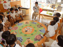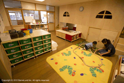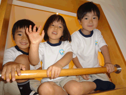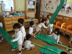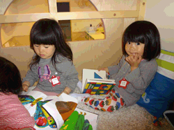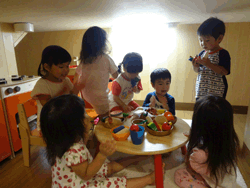 「みんな」を大切にしている一方で、一人ひとりが好きな遊びをじっくり楽しめるようコーナーを常設している。 クラスでの時間(同年齢)をベースに、午前中はクラスでの活動(主に戸外)がメインとなっている。午後になると部屋の壁(ドア式)を開放することで、4・5歳児クラスとの連続した空間が生まれ、異年齢であそぶことが可能な環境を用意している。 |