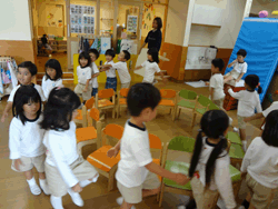 幼児になりほぼ自立している子どもが多いがまだ不安定な部分も持ち合わせているため、2歳児クラス同様自分たち専用のスペースになっている。
