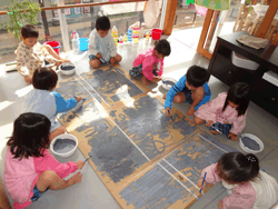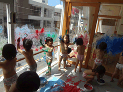明るいアトリエは、「どんなに汚してもいい部屋」となっている。模造紙に絵を描いたり、ボディーペインティングを楽しむ等、ダイナミックに造形遊びを楽しみたい時に活用している。