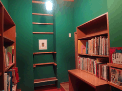 絵本の持つ「ファンタジーな世界」を再現するため、まるでハリーポッターの寮の部屋のようなやや薄暗く緑の壁の怪しげな空間となっている。