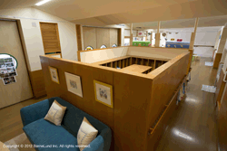 暗いアトリエは、より「科学的・実験的にマニアックに遊びに没頭できるための空間」となっている。そのため部屋の中には様々な棚が用意され、豊かな素材から自分の遊びに合わせたものを選択し自由に取り入れて遊びベルような環境になっている。 また、周囲の小窓を遮蔽することで、暗室にすることもでき、蛍光塗料で絵を描いたり、影や光を使った遊びを楽しむこともできる。 |