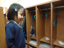 通常は保育室内や廊下等、保育者や大人からよく見える管理し易い場所にロッカーがある。 しかし、あえて独立した空間として位置づけることで、朝「保護者の作ったリズム」から、子ども自身の意思「自分の生活リズム」に切り替えることが保障されている空間である。 また、一人一人のロッカーがあることで、所有物の管理がし易いことに加え、明確な「自分の居場所」ともなり、落ち着いた雰囲気の中で個々のリズムで気持ちの整理を行うことができる。そのため周囲を壁で取り囲み見えにくい環境にすることで、子ども自身は誰からも干渉されることのない空間となっている。 |