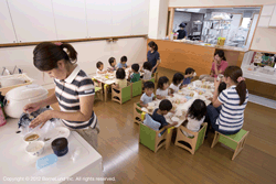 3歳児以上は食器と料理が別に用意され、自分で食べる量を決めて配膳をする。好き嫌いはせず、責任を持って取った物を食べるようにしている。またおかわりも自由にすることができ、自分のお腹の具合と相談しながらおかわりをするよう伝えている。 3歳児以上は掘りごたつで食べ、自由な空間の中で友達と食べることで、関係性を深めていくことを大切にしている。また、空いているスペースを譲り合い、人の気持ちを感じることができるようにという思いも込められている。 堀りごたつ以外にも、外を見ながら食事できる窓際のカウンターや、配膳のためのカウンターはアイランドキッチンとしても活用でき、子どもを中心に豊かに食育が行われている。 |