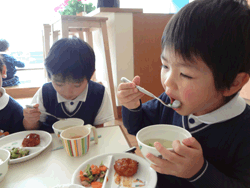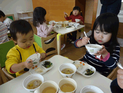 2歳児は台所前のランチスペースを使い、一人一人の椅子で自分用に配膳された食事を食べることで安心した雰囲気を作っている。また、食事のタイミングは個々に対応し、十分に遊びお腹がすいた子どもから順次食べていくことで、子どもの「食べたい!」という気持ちを大切にすると共に、集中して食べる雰囲気を大事にしている。 |