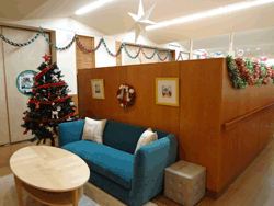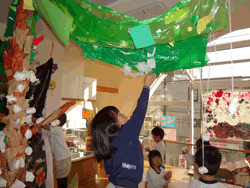 また、部屋の中心にあるジャングルのような木は、5月頃から子どもたちが散歩のときに拾った葉っぱを飾りたいという思いから始まり、夏には虫や花を作って付けたり、秋になると様々ン枯葉を装飾し、クリスマスの時期には巨大ツリーに変身していった。日常の子どものつぶやきからどんどん形を変え、8ケ月以上この部屋にあるシンボルツリーとなっている。 |