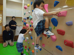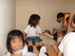 園庭がないことから、気軽に体を動かして遊べる環境をここに作ることが多く、幼児クラスが跳び箱やクライミングウォール等でダイナミックに遊ぶ姿が見られる。 特に雨天時は、運動遊びのためにサーキットコースを設定し、室内でも思いきり体を動かし、エネルギーを十分に発散しながら楽しめる環境を作っている。 |